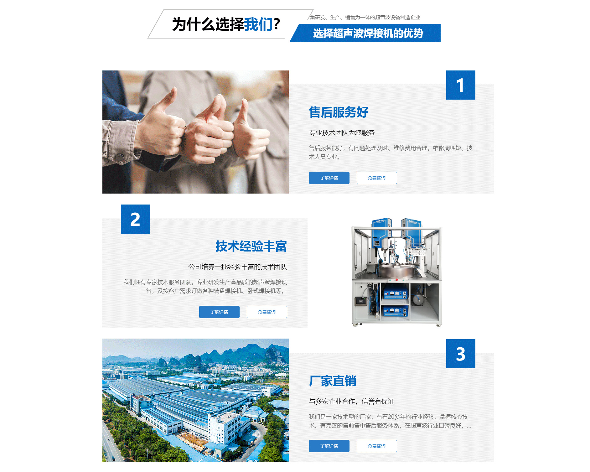 關于我們廈門勁榮機械設備有限公司是一家集研發(fā)、生產(chǎn)、銷售為一體的超音波設備制造企業(yè),主要產(chǎn)品包括多規(guī)格型號的超音波塑膠熔接機、熱板式塑料焊接機、多工位轉(zhuǎn)盤焊接機、振動摩擦焊接機、旋轉(zhuǎn)式塑膠熔接機及配套的工裝夾具等。公司自2003年成立以來,一直致力于產(chǎn)品不斷完善中,并追求產(chǎn)品的精益求精,于2004年向國家商標局注冊了“勁榮”牌商標,2009年榮獲廈門市商標。 經(jīng)過多年的努力,公司已經(jīng)發(fā)展成為占地面積2000余平方米、擁有員工50余人的企業(yè)。公司一直將“品質(zhì)是企業(yè)發(fā)展的原動力”作為經(jīng)營理念,嚴把質(zhì)量關,建立了一整套有效的安全生產(chǎn)及管理模式,不僅贏得了同行的認可,更取得了客戶的信賴,先后與九牧集團、路達工業(yè)、建霖集團、西伯電子、蒙發(fā)利實業(yè)、松霖科技、銥科集團、科司特電子等公司建立了長期的合作關系。 面對已經(jīng)取得的成績,我們不驕不滿,因為深知業(yè)績只能代表過去,只有靠良好的產(chǎn)品質(zhì)量和完善的售后服務才能在客戶中口碑相傳,在...